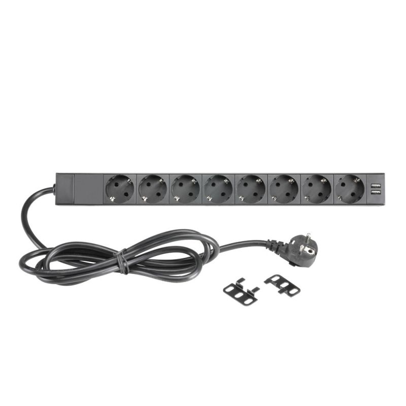 8-pistorasiainen 19" räkkiin asennettava virranjakaja, jossa kaksois-USB-latausportit ja virtakytkin. Nimellisjännite 250 V, 16 A. Alumiinikotelo, 8 pistorasiaa takapaneelissa ja 2 USB-latausporttia etupaneelissa. Valaistu virtakytkin etupaneelissa. 2 m virtajohto. Mukana käännettävät räkkikiinnikkeet.