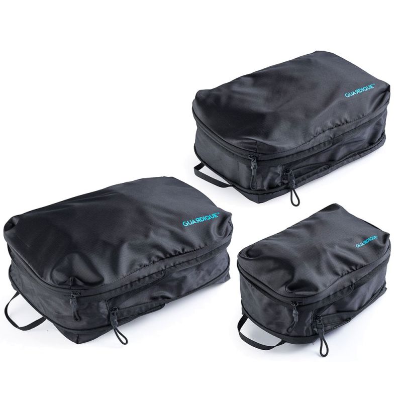 - Tyylikäs & Hienostunut: Minimalistinen musta muotoilu, jossa on hienovarainen sininen GUARDIQUE™-brändäys, lisää matkatarvikkeisiisi tyylikkään ja modernin ilmeen.