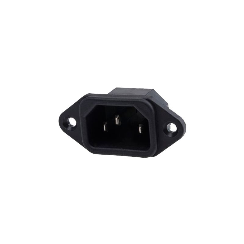 Kestävä 10 ampeerin C14-laippaliitin paneelikiinnitykseen, 6,3 mm lattaliittimillä. Suurin paneelin paksuus 2 mm. Soveltuu moniin verkkovirran sisääntulosovelluksiin.