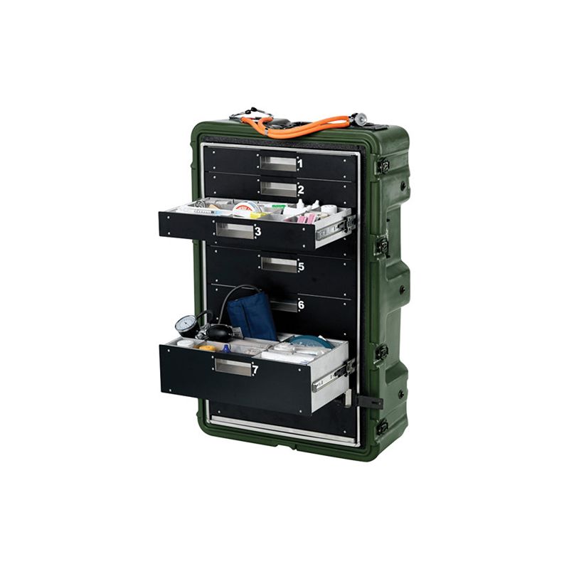 Peli Hardigg MC8100 Medchest 8 Drawer (Olive Drab Green) on ilmatiivis, vesitiivis ja paloa hidastavasta rotaatiovaletusta polyeteenistä valmistettu säilytyslaatikko. Se on suunniteltu ensivastevarusteiden ja lääkkeiden kuljettamiseen. Kotelossa on täyden ulosvedon kuulalaakeroidut liukulaatikot. Laatikkojako on seuraava: neljä 2.9” leveää, kaksi 3.9” leveää ja kaksi 4.9” leveää laatikkoa. Yksi laatikoista on lukittava. Lisäksi siinä on jousikuormitteiset perhoslukot, irrotettava ruostumattomasta teräksestä valmistettu tarjotin sekä muokattava väliseinäjärjestelmä.